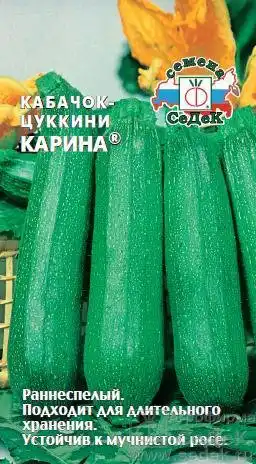 Кабачок «Карина» - Оригінатор сорту агрофірма «СеДеК». Дозволено до посадки у п'ятому – Центрально-Чорноземному регіоні. Дозріває рано, є кущовою, компактною рослиною із середніми листовими пластинками частіше за темно-зелене забарвлення із середнім розсіченням. Форма кабачка в технічній стиглості - циліндрична, він слаборебристий, дуже протяжний, діаметр плода середній, забарвлення темно-зелене. Щільність м'якоті сорту висока, проте вона дуже ніжна. Маса кабачка 0,8 кг. Дегустатори оцінюють смак як добрий. Усередині плоду знаходиться середнє за розміром, біло-кремове насіння еліптичної форми. Урожайність сягає 653 центнери з гектара.