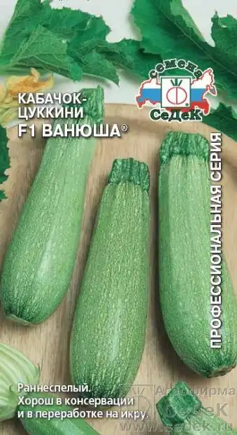 Кабачок «Ванюша F1» - Оригінатор гібрида агрофірма «СеДеК». Дозволено до посадки у третьому – Центральному регіоні, а також п'ятому – Центрально-Чорноземному регіоні. Дозріває рано, є кущовою рослиною із середніми листовими пластинками частіше за світло-зелене забарвлення із середнім розсіченням і ледь помітними плямами. Форма в технічній стиглості - циліндрична, поверхня слаборебриста, забарвлення світло-зелене, присутні світлі смужки на поверхні. Діаметр кабачка та його довжина середні. Щільність м'якуша висока, сама м'якоть ніжна. Маса плода гібриду становить 1,5 кг. Дегустатори оцінюють смак як добрий. Усередині плоду знаходиться середнє за розміром біло-кремове насіння еліптичної форми. Урожайність досягає 915 центнерів із гектара.