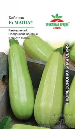 Кабачок "Маша F1" - Оригінатор гібрида агрофірма «СеДеК». Дозволено до посадки у третьому – Центральному регіоні, а також п'ятому – Центрально-Чорноземному регіоні. Дозріває рано, є кущовою, компактною рослиною із середніми листовими пластинками частіше за зелене забарвлення зі слабким розсіченням і середньопомітними плямами. Форма в технічній стиглості – циліндрична, він слаборебристий, середньої протяжності та діаметра, забарвлення біло-зелене, присутні світло-зелені плями на поверхні. Щільність м'якоті середня, вона дуже ніжна. Маса кабачка 1,2 кг. Дегустатори оцінюють смак гібрида як добрий. Усередині плоду знаходиться біло-кремове насіння середнього розміру та еліптичної форми. Зібрати можна до 896 центнерів із гектара.