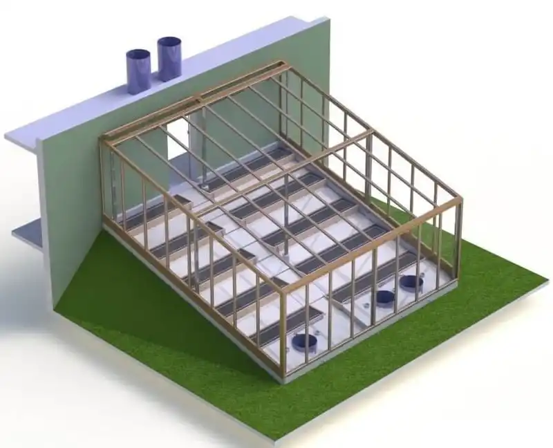 Далі — дах, його роблять плоским, а не похилим або дугоподібним, як у теплиці, і накривають полікарбонатом, оскільки він краще за інші матеріали утримує тепло. Через війну сонячні промені майже завжди падають перпендикулярно та його відбиток буває мінімальним.