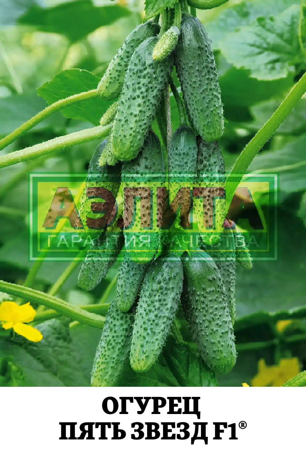 Наступним гібридом, на який хотілося б звернути вашу увагу, є огірок «П'ять зірок». Це суперпучковий ультраранній партенокарпічний гібрид останнього покоління. Одночасно у кожному міжвузлі формується 5 -10 зав'язей. Зеленці невеликі, довжиною близько 9 – 10 см, дрібнобугорчасті, з абсолютною відсутністю гіркоти, ідеально підходять для споживання у свіжому вигляді та для заготовок на зиму. При соленні та маринуванні зберігають форму, щільність та пружність. Відмінною рисою огірка «П'ять зірок» є здатність переносити похолодання без зниження інтенсивності плодоношення. Гібрид стійкий до кореневих гнилей, кладоспоріозу, вірусу огіркової мозаїки та справжньої борошнистої роси.