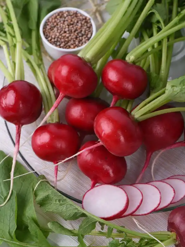 Редиска можна сіяти різних сортів, але найнадійніше сіяти Кармен, Меркадо, Спартак, Маяк, Ювілейний ці сорти мають відмінні смакові якості, без порожнеч, стійкі до квітучості; пекінську капусту ми рекомендуємо сорти Любаша, який відрізняється ранньостиглістю та відмінним смаком. Насіння цих культур швидко проростає навіть за низьких температур. Тому їх висівають по замерзлому ґрунту зазвичай у третій декаді листопада. Норма висіву 5 – 6 г редиски та 2 – 2,5 г пекінської капусти на м² площі. Закладають насіння талим торфом, запасеним завчасно, на глибину 2 – 3 см. Потім посів засипають снігом.