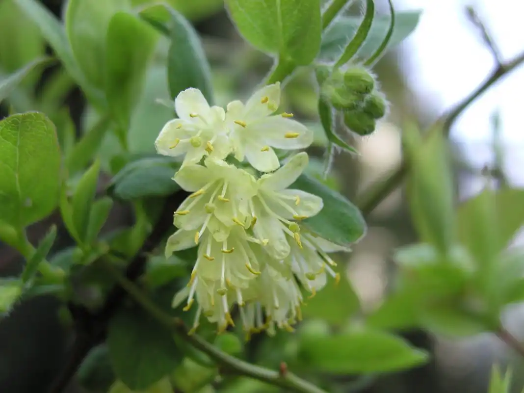 Квітки жимолості дрібні, пелюстки віночка жовті різних відтінків. За формою квітки лійчасті, розташовані в пазухах листя. Залежно від сорту їх кількість варіює від 2-4 до 5 в одному букетику. Цвітіння починається у травні і вже у червні дозрівають перші плоди.