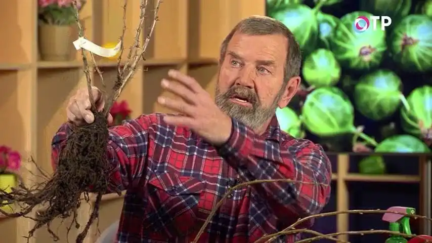 Ми вибираємо саджанці. Якщо навіть вони з відкритою кореневою системою, то обов'язково вибираємо і дивимося не тільки по чудовим ось цим гілочкам, так? Подивіться, який чудовий кущ. Але й за кореневою системою, щоб вона була великою, великою, здоровою, вже з всмоктуючими корінцями — таке біленьке тоненьке волосся.