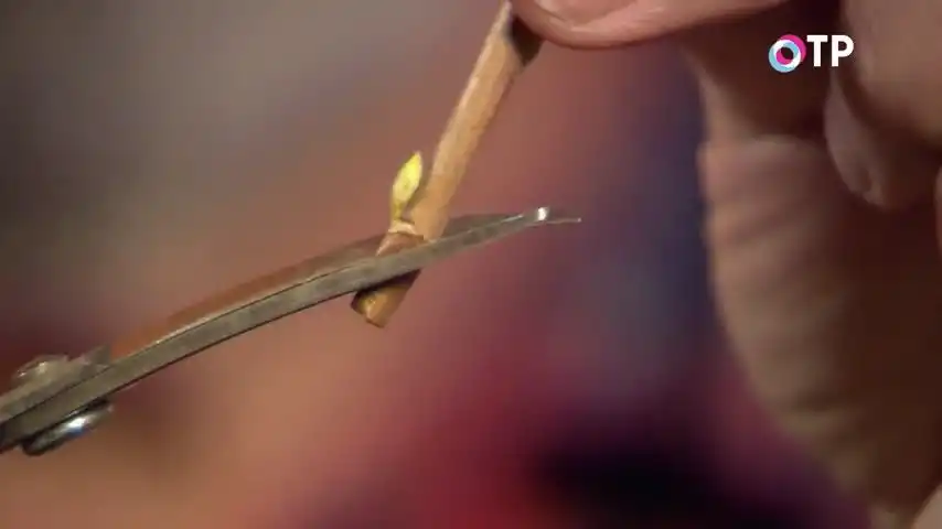 Зріз робимо, подивіться, будь ласка, під ниркою, навскіс. Ось такий зріз у нас вийшов. Можна поставити у воду тимчасово, можна покласти на ґрунт – нічого страшного. Робота відкладеться ненадовго. Ще одна гілочка, добре розвинена, висока. Ще обрізаємо один черешок. Ось так. Ось, знову ж таки, під куточок ми зробили зріз і знову кладемо у воду.