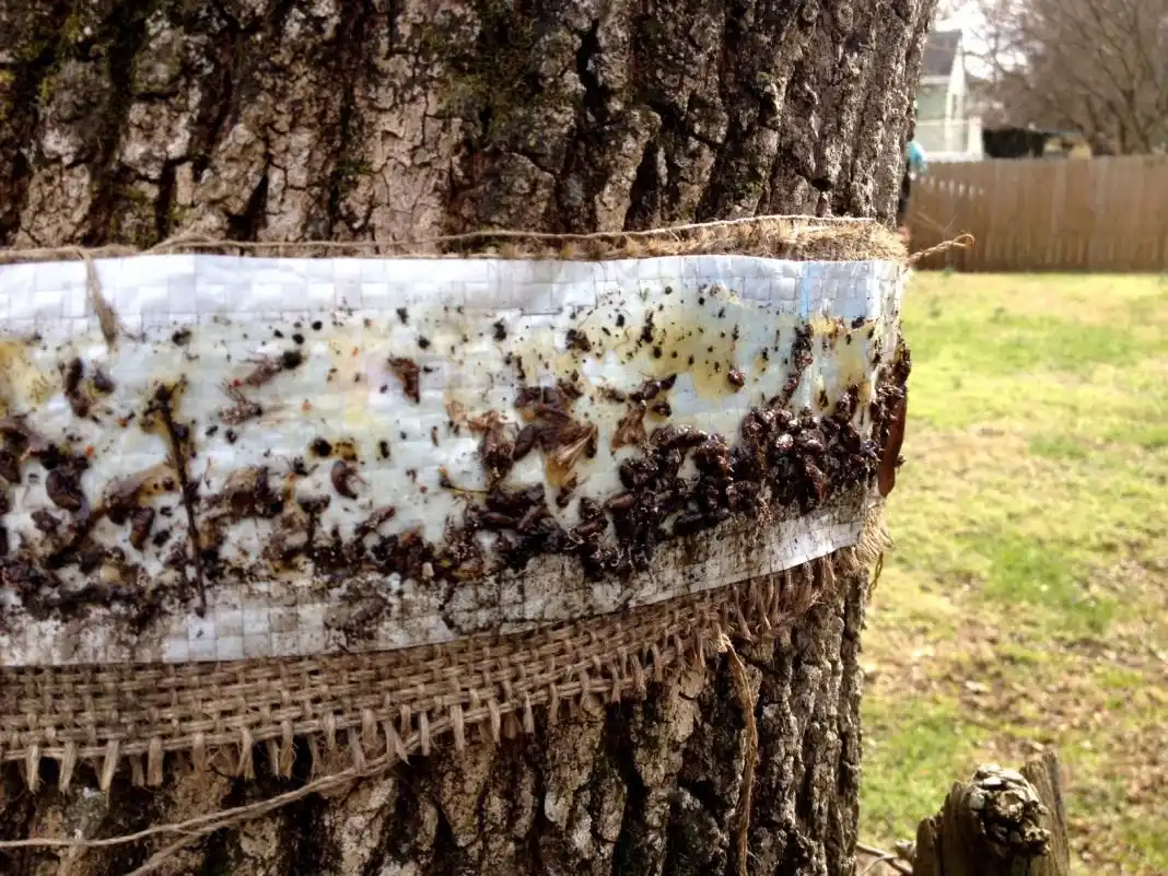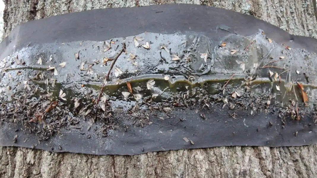 - липкі ловчі пояси, оброблені спеціальною клейкою, в'язкою масою та закріплені на деревах, які діють за принципом звичайної пастки для мух або попелиці.