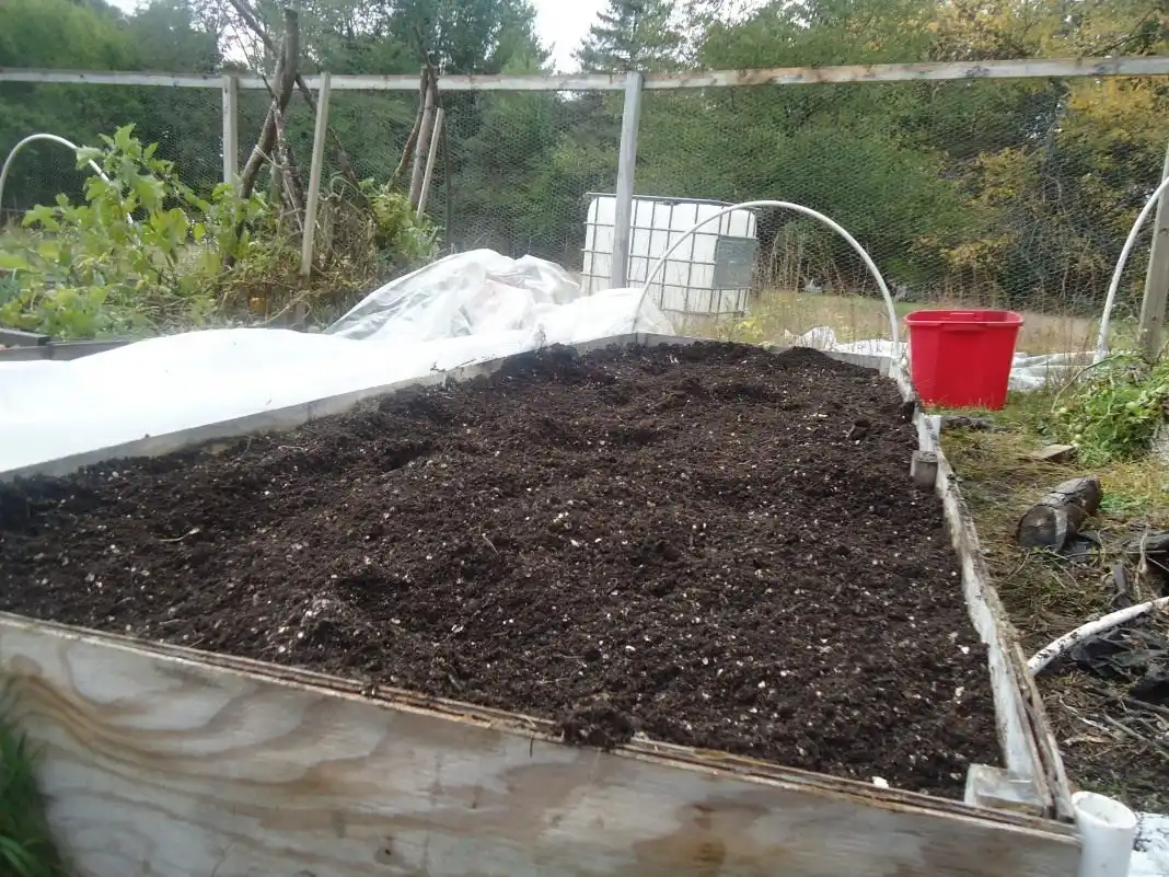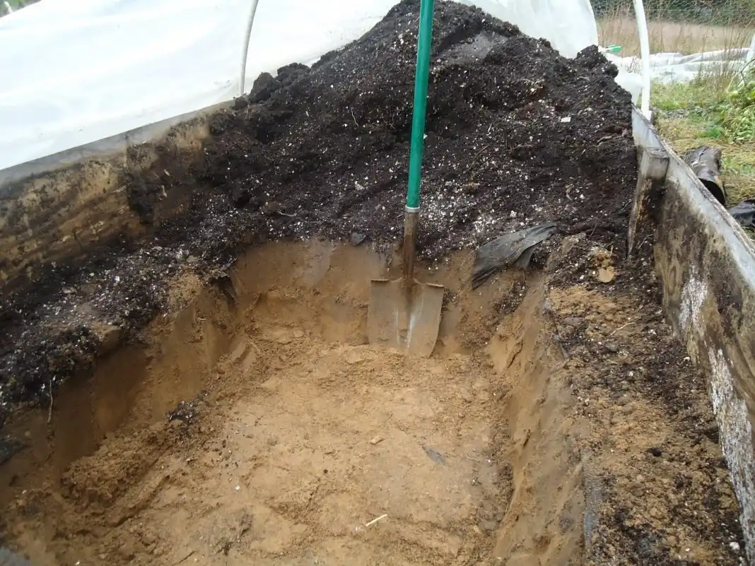 При осінньому пристрої знімають верхній 10 см шар ґрунту. Траншею, що утворилася, заповнюють свіжим або напівперепрілим гноєм приблизно 15-20 см. Зверху накидають шар листя або бур'янів. Якщо немає готової органіки, заповнюють дрібними відходами гілок, бур'яном, відходами з городу, іншим побутовим сміттям, здатним в певних умовах перегнивати або компостуватися. Цей шар біопалива злегка ущільнюють, засипають знятим ґрунтом, мульчують, формуючи шар 10-15 см. У такому вигляді грядка йде в зиму.