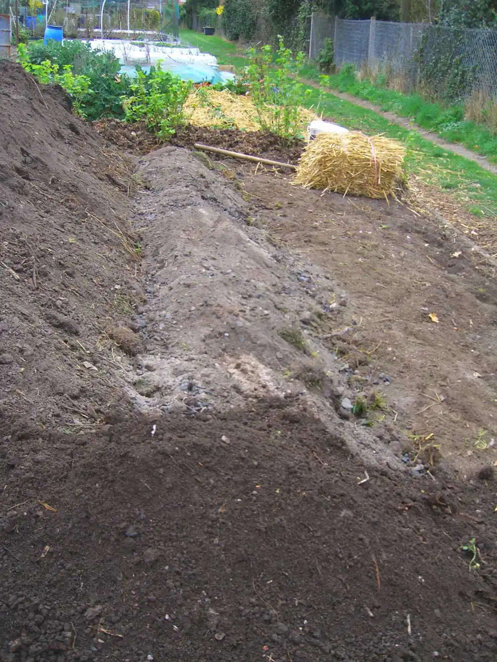Прокопують і складають осторонь верхній 10-15 см шар ґрунту. Траншею засипають дренажним шаром, використовуючи щебінь, пісок. Дренажний шар потрібен на глинистих ґрунтах або ділянках із близьким до поверхні стоянням води.
