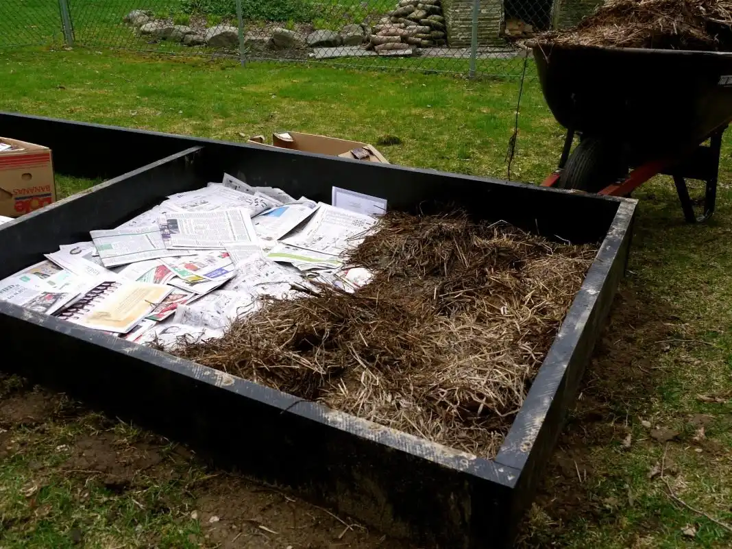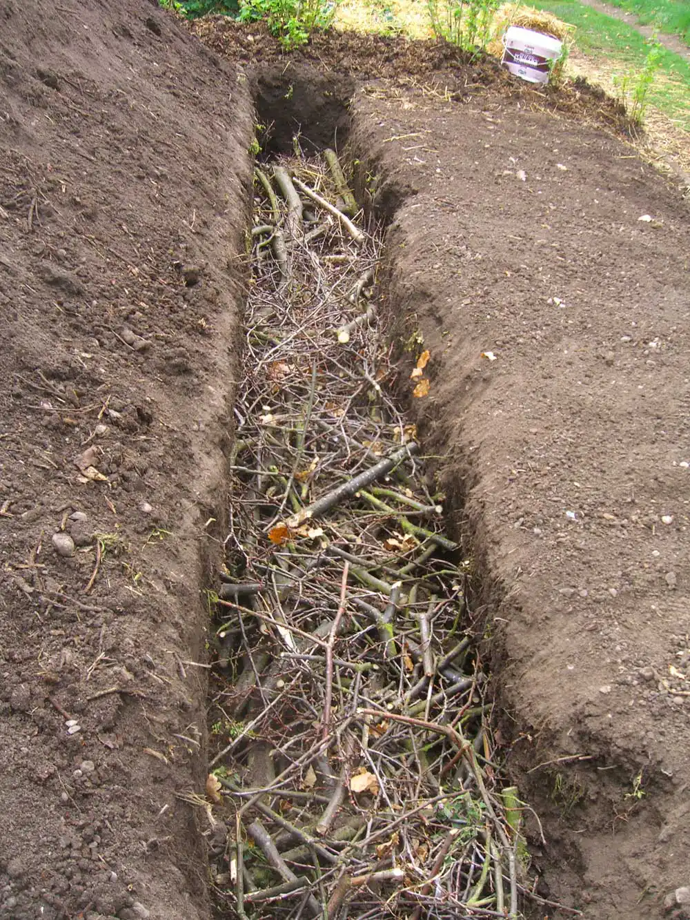 На дренажний шар укладають грубий матеріал: товсті цурки, гілки, коріння та дрібно порубані стовбури висотою до 30 см. Пересипати шар ґрунтом, ущільнити. Зверху розташувати 15-20 см шар дрібнішого біоматеріалу - різні рослинні та побутові відходи, листя, здорове бадилля городніх рослин (крім картоплі та томатів), бур'яни. Шар утрамбувати, пересипати ґрунтом.