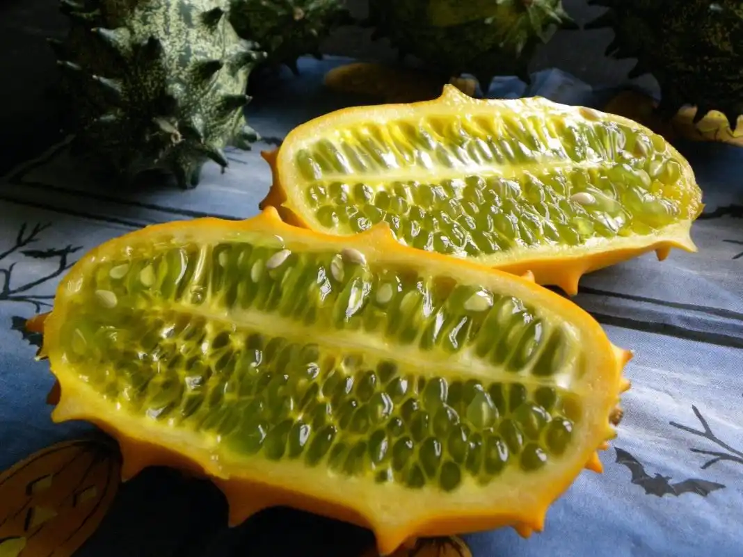 Як і китайські огірки, ківано формують 3 метрові тонкі міцні стебла, що лазять по опорах. Плоди, до 15 см завдовжки жовтого або оранжевого кольору, покриті м'якими шипами. Кисло-солодкий смак желеподібної яскраво-зеленої м'якоті нагадує банан чи звичайний огірок.