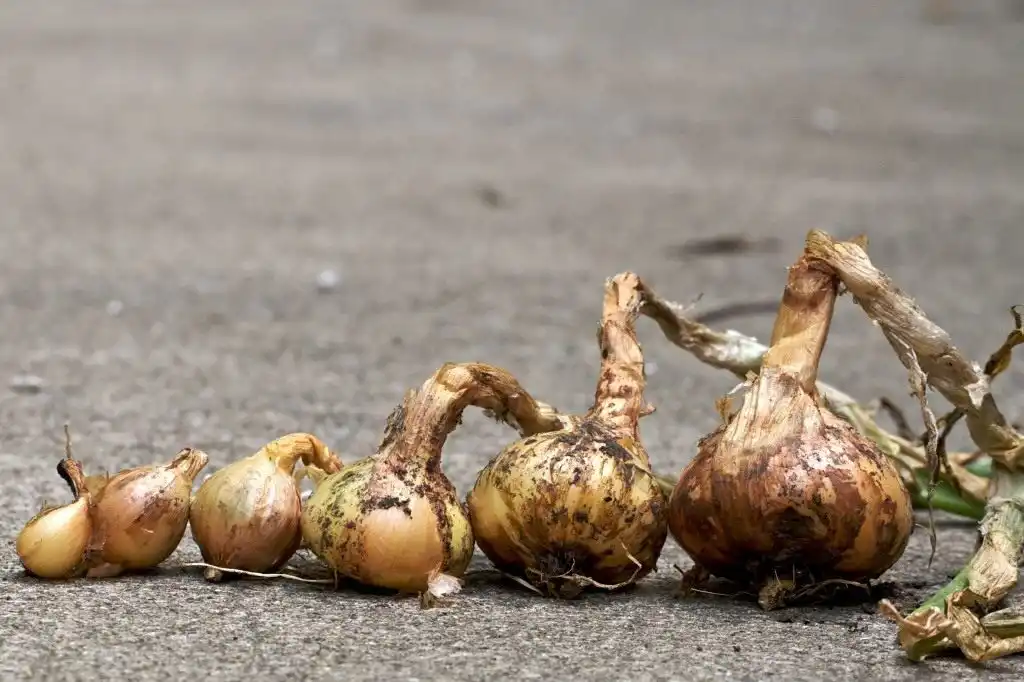 Настання фази дозрівання та збирання врожаю визначають за станом листя. Їх вилягання та пожовтіння свідчать про дозрівання цибулин. У суху та сонячну погоду цибулини висмикують із ґрунту та залишають на місці або переносять під навіс і сушать протягом 7-10 днів. Перебирають і обрізають, залишаючи пеньок 5-6 см. Якщо грунт щільний, то коріння підрізають, намагаючись не пошкодити цибулину.