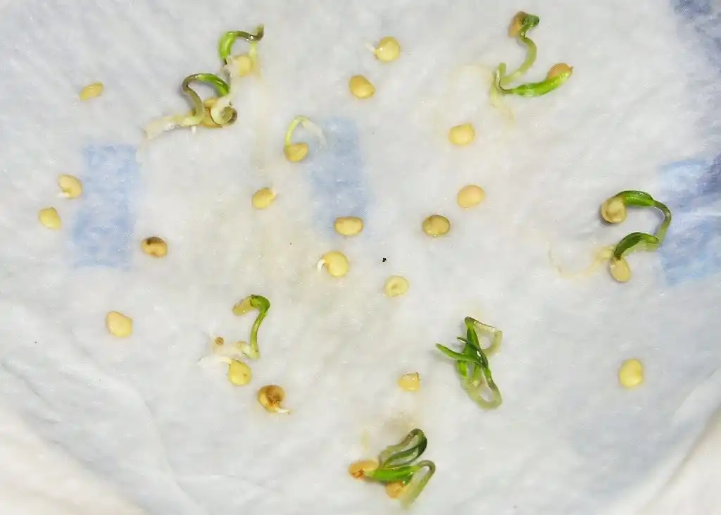 - Насіння перцю проростає дуже повільно, тому його перед посівом пророщують. Підготовлене до посіву насіння розсипають на складену кілька шарів тонку тканину в неглибокому блюдце. Зволожуємо її. Накриваємо такою ж зверху і залишаємо при температурі +20...+25 ºС. Щодня, іноді по 2 рази на день змочуємо матеріал. У такій вологій камері перці через 2-3 дні накильчать, проростуть. Злегка підсушуємо насіння та висіємо у підготовлену тару.