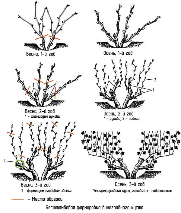 Розглянемо у статті (схематично) принцип формування безштамбового та штамбового кущів винограду. Ці види формування найбільш прості і найчастіше вдало застосовуються новачками при самостійному обрізанні та навантаженні лози.