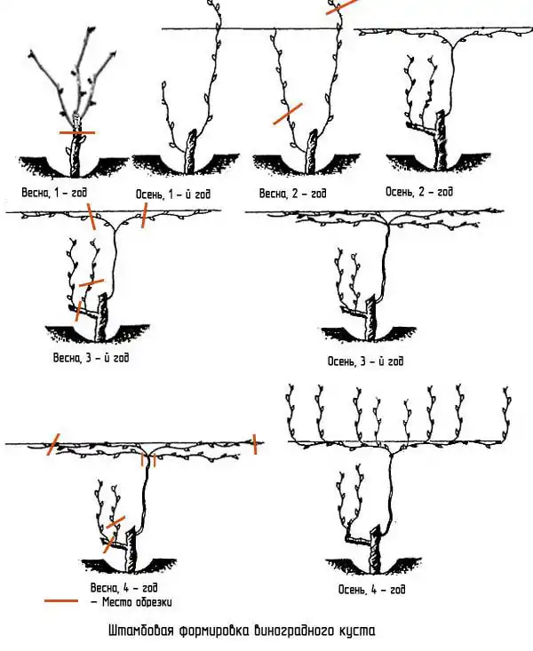 Штамбове формування виноградного куща застосовується в регіонах з відкритим вирощуванням виноградної лози морозостійких сортів.