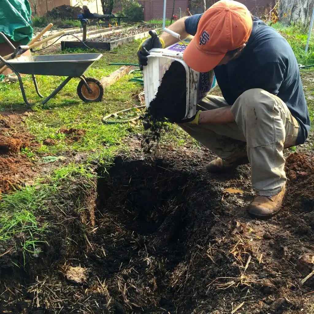 Після того як живильний прошарок закладено, зверху необхідно викласти близько 10 см землі - це дасть можливість початися процесам гниття, якщо траншея готується заздалегідь, і захистить обрізані коріння саджанців від зіткнення з шаром, що розкладається.