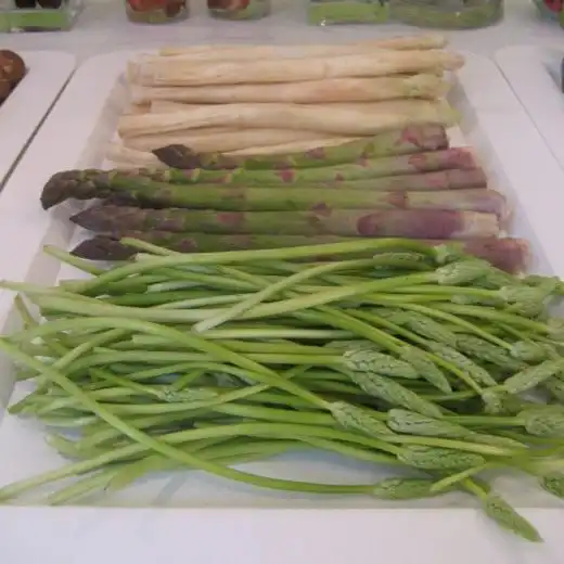 Спаржа зелена. Молоді стебла спаржі розрізати на шматочки по 2 см, зварити в підсоленій воді, потім відкинути, дати стекти воді, заправити цибулею, що пасерує, петрушкою, естрагоном, після чого залити збитими яйцями і запекти.