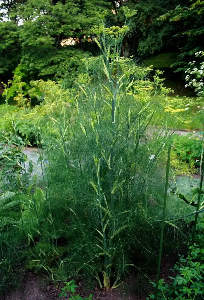 Потужні рослини фенхелю з витонченими, розсіченими на тонкі ниткоподібні частки листям і великими суцвіттями-парасольками з жовтими квітками можуть бути центром декоративної композиції з пряних трав.