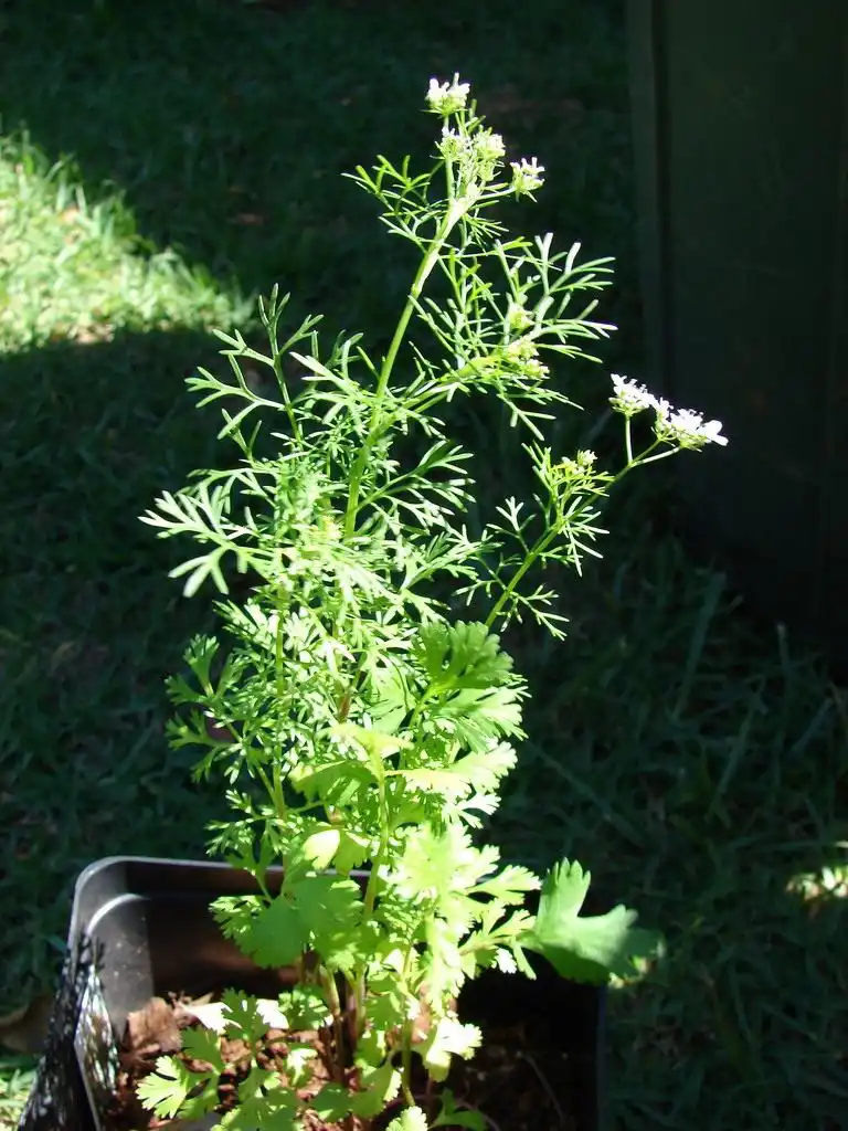 Коріандр посівний, або Кінза (Coriandrum sativum) - Однорічна трав'яниста рослина сімейства Парасолькові (Apiaceae), одна з найпопулярніших пряних трав. Стебло у коріандру прямостояче, голе, висотою до 40-70 см, розгалужене у верхній частині. Прикореневе листя широколопатеве, крупно розсічене, з широкими часточками і довгими черешками, верхнє листя на коротких черешках з вузькими лінійними часточками. Квітки дрібні, білі чи рожеві, розташовані складними парасольками на кінцях квітконосів, утворюючи 3-5 променів. Крайові квітки завдовжки 3-4 мм.