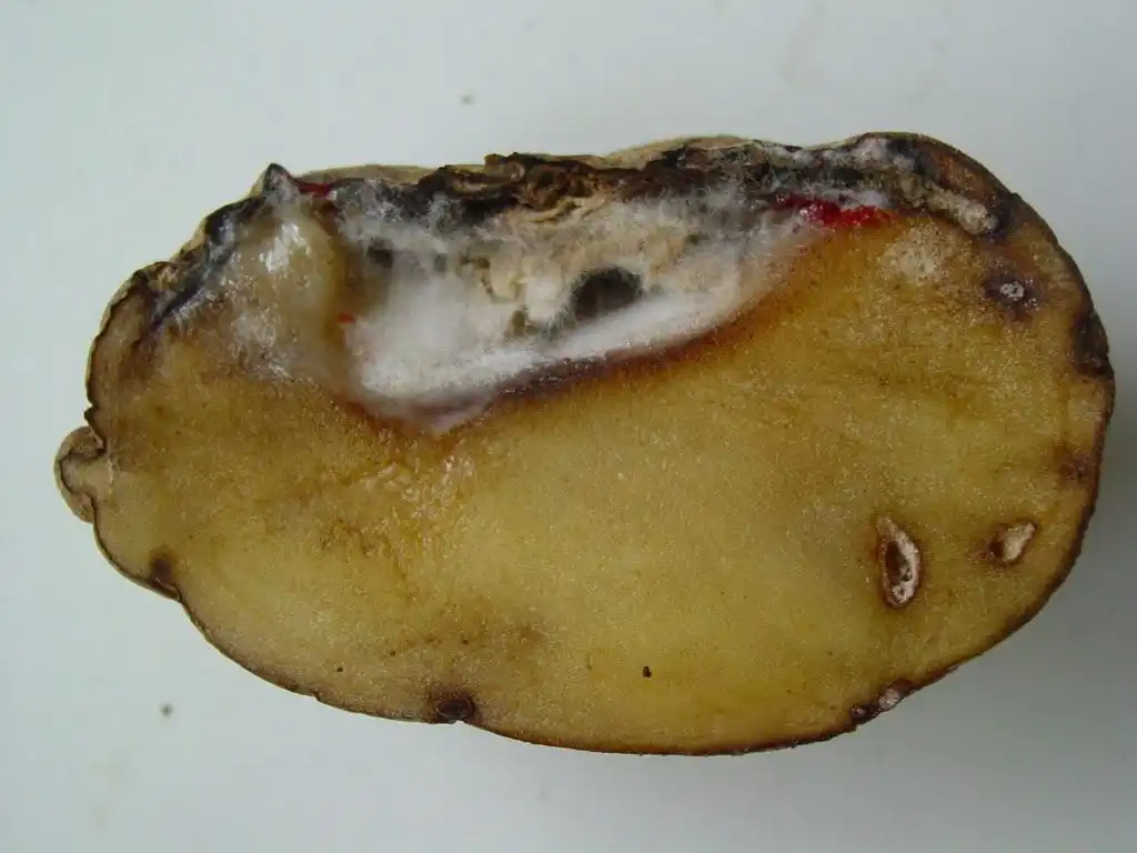 Хвороба розвивається на бульбах під час зберігання картоплі. На бульбах утворюються сірувато-бурі злегка вдавлені плями. Потім м'якоть під плямою стає пухкою, набуває бурого забарвлення. У ній утворюються порожнечі, заповнені білим, жовтуватим або темним пухнастим міцелієм гриба. Уражена тканина швидко підсихає, шкірка зморщується, утворюючи складки навколо початкової плями.