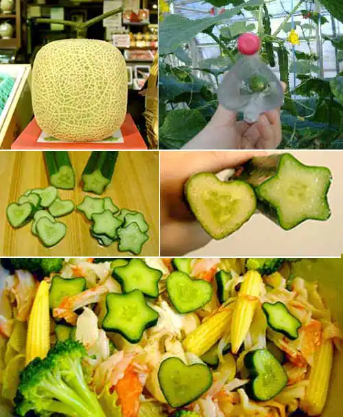 У Японії фантазії городників пішли дуже далеко. В руках овочівників кавуни та огірки можуть набувати абсолютно фантастичних форм. Багато деталей технології запатентовані та засекречені. Але принцип той самий – пластиковий шаблон. На фото ви бачите кавуни не тільки кубічної та пірамідальної форм, але й фантазійні кавуни у вигляді голови людини!