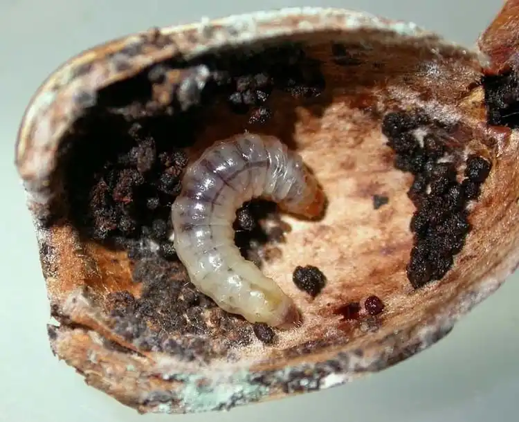 Гусениця закупорює вхід і прогризає численні ходи у плоді та насіннєвій коробці. Згодом спостерігається передчасне дозрівання та опадання плодів, заражених гусеницями. Залежно від клімату розвивається від 1 (північні райони) до 3 (Центральна Азія) поколінь. Лялечка локалізується на штамбах у тріщинах кори, в тарі, що зберігається, і грунті на глибині до 3 см біля кореневої шийки, а також на поверхні землі під сміттям і рослинними залишками.