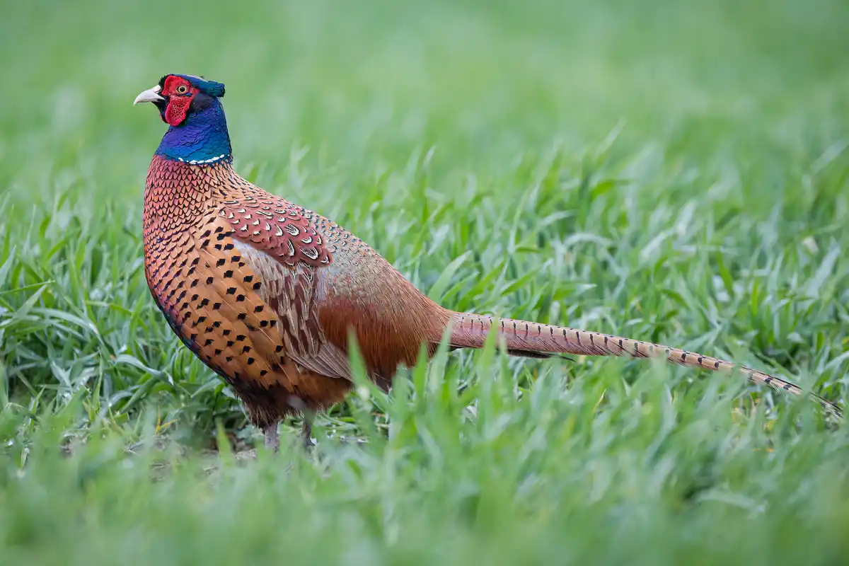 Зелений фазан у дикому вигляді мешкає в Японії, був акліматизований у Сполучених Штатах Америки. На відміну від звичайного фазана, його груди та живіт смарагдово-зеленого кольору, лицьова частина – червона, шапочка – зелена, верхня частина шиї – синя, крила та хвіст блакитно-сірі. Довжина хвоста у самця близько 40 см, загальна довжина - до 80 см. Загальна довжина фазанки -50 см, хвіст - до 30 см. Вага самця близько 1 кг, самки - 700 г.