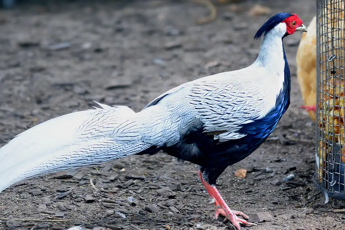 Голову самця срібного фазана прикрашає чорний чубчик з подовженого пір'я, лицьова частина голови - червона неоперена, дзьоб - жовтий, шия прикрашена білим капюшоном, нижня половина тіла синьо-чорна. Спина, крила вкриті сріблястим пір'ям з тонкою чорною окантовкою, хвіст білий, ноги — червоні. Довжина хвоста до 120 см. Батьківщина - Південний Китай.