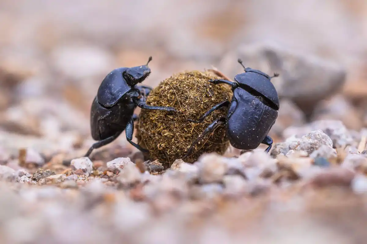 Катають кульки з гною, вправно переміщаючись при цьому головою вниз і задніми кінцівками утримуючи гнійну кульку. Кульки ці – їжа та будівельний матеріал для гнізд, куди будуть відкладені яйця. Дуже практична речовина для гнізда: після зовнішнього затвердіння досить надійна, при цьому не втрачаючи своїх цінних якостей: личинки їм харчуватимуться в процесі зростання.