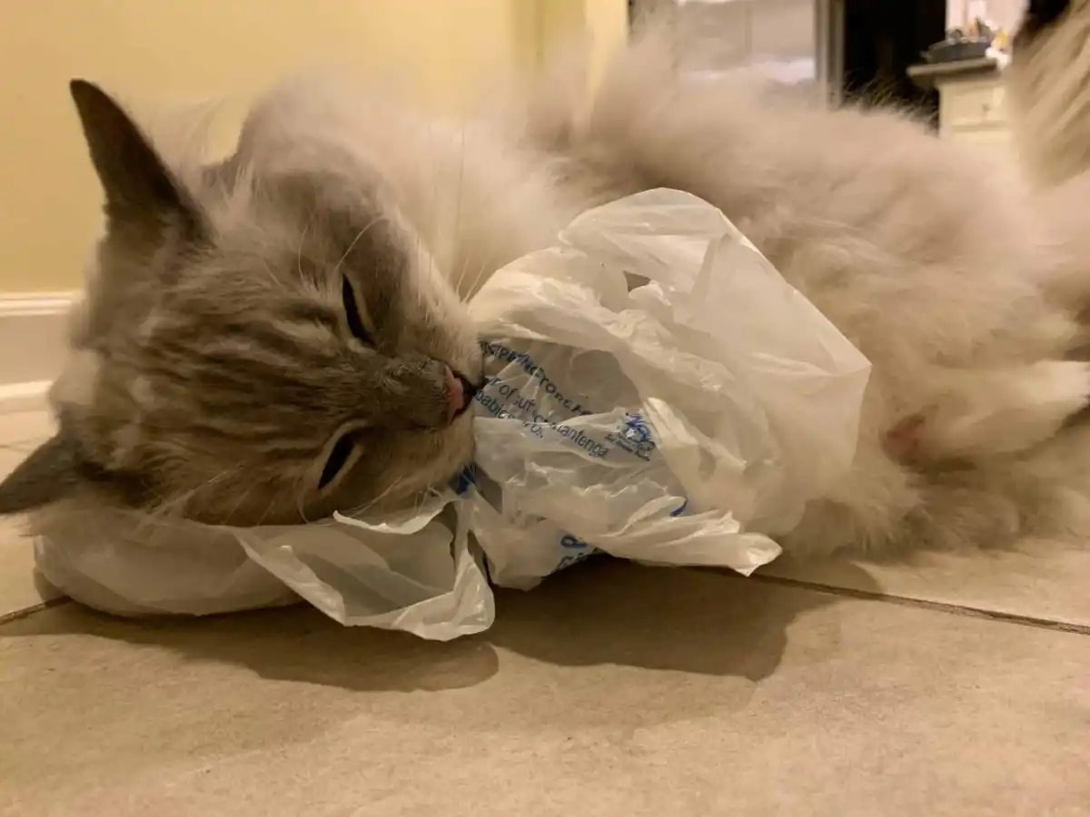 Пакети — небезпечніші іграшки в порівнянні з коробками, але через сильне шарудіння котам більше подобається грати з ними. У процесі гри вихованці сильно завзяті і можуть рвати пакет кігтями як видобуток, а потім з'їдати його по шматочках. На відміну від картону целофан набагато важче залишає організм кішки і може травмувати внутрішні органи. Навіть кілька шматочків целофанового пакета в шлунку вихованця можуть призвести до закупорки та стати приводом для хірургічного втручання.