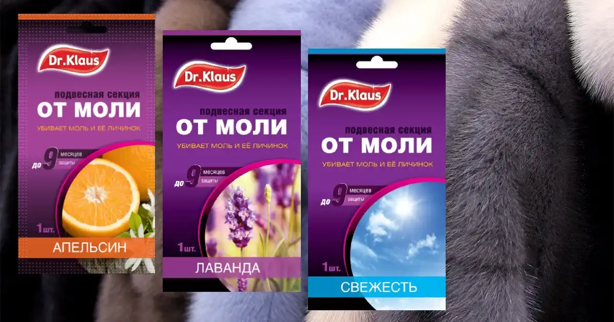 Щоб не залишити шкідникові жодного шансу, між шубами розвішуються. інсектицидні секції Dr.Klaus, Орієнтовно, по 2 штуки на кожні 2 куб. об'єму шафи. Секції мають зручні гачки, тому їх легко прикріпити на будь-які вішалки. Засіб забезпечує надійний захист хутряних речей до 9 місяців, чого зазвичай вистачає весь сезон зберігання.