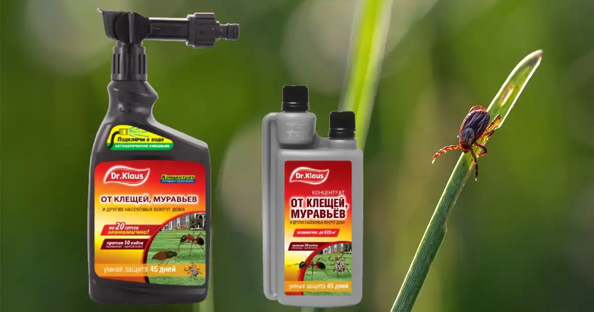Для акарицидних обробок ділянки можна використовувати два препарати торгової марки Dr.Klaus. Перший – це концентрат з дуже зручним розпилювачем (ежектором). Щоб обробити ділянку, її потрібно приєднати до водопроводу (централізованого або локального). При подачі води вона автоматично змішується з концентратом і подається рівномірним струменем на територію, що обробляється. Однієї каністри вистачає приблизно на 20 соток, тобто, для всієї території більшості стандартних ділянок. Одноразова обробка забезпечує захист до 45 днів.